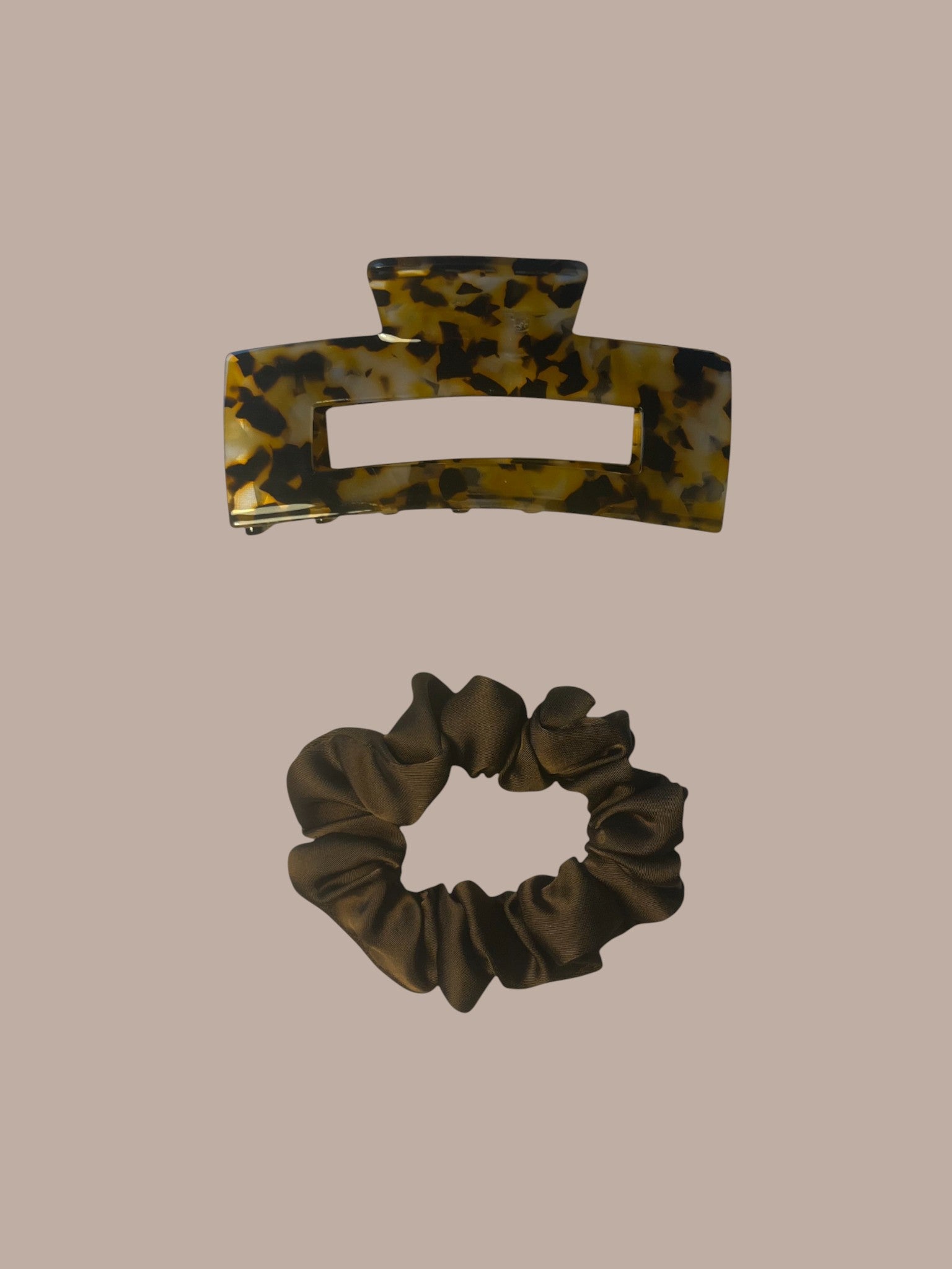 Kombinationen av en mjuk scrunchie och rejäl hårklämma i en mjukbrun färg gör detta set perfekt för dig som vill ha både funktion och stil. Skonsamt för håret, lätt att använda och snyggt till alla outfits. Använd klämman för snabb uppsättning och scrunchien för detaljer och stadga.